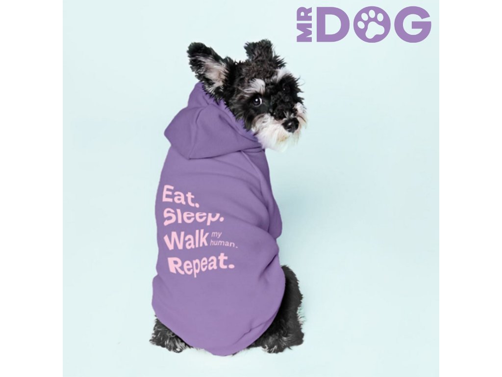 - Text „Eat. Sleep. Walk my human. Repeat.“ zaujímavo oživuje vzhľad mikiny.